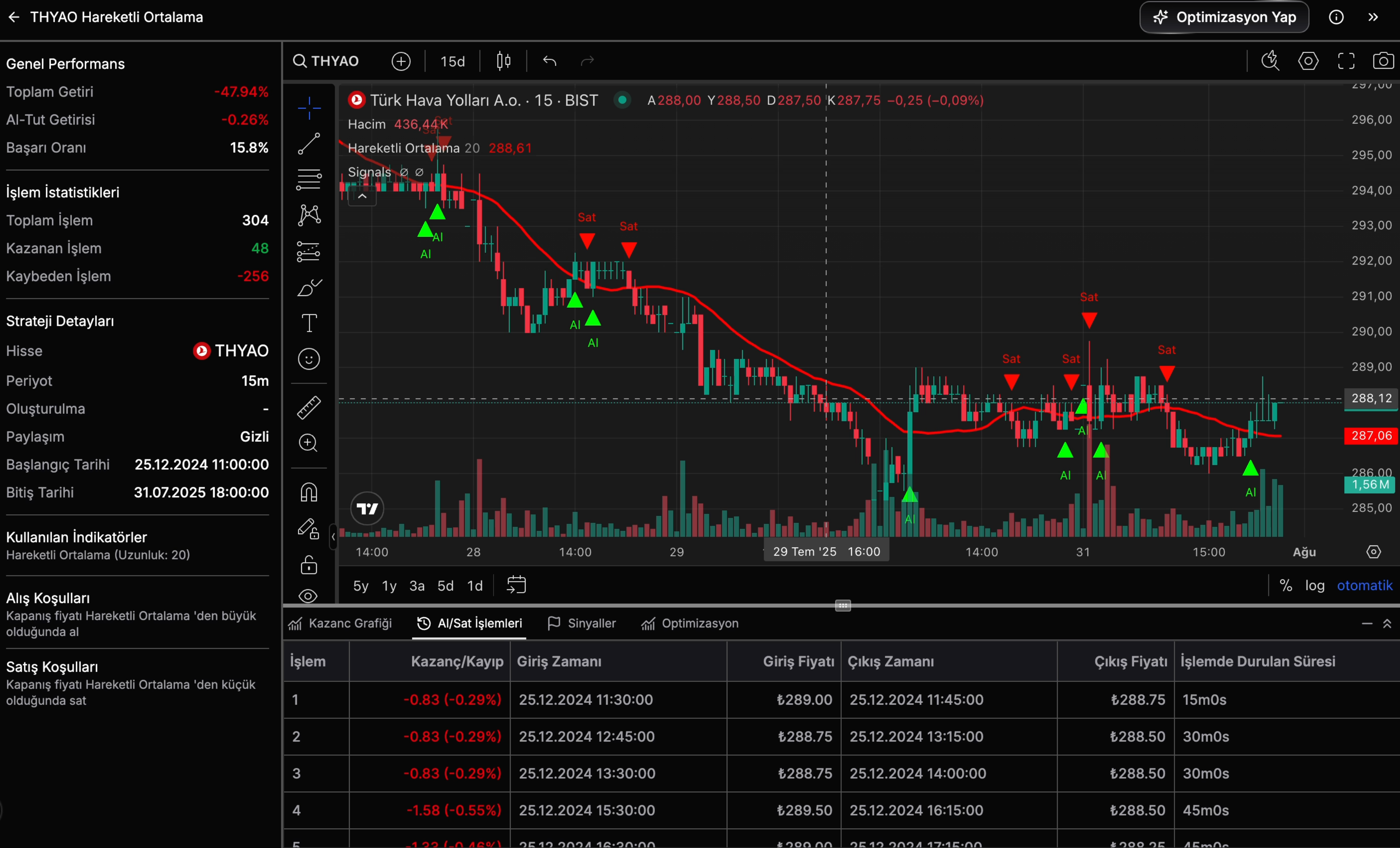 Alım-satım kurallarını kur, stratejini geçmiş veride test et; En yüksek getiri için otomatik optimize et.